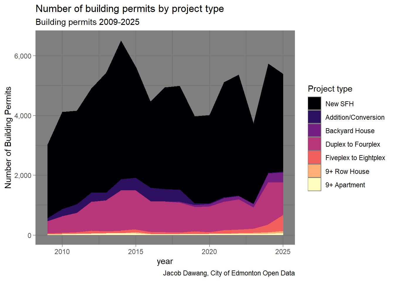 Edmonton’s general building permit data has tracked building permits since 2009. It contains columns for building type, work type, location, units added, and more for each building permit. This data and processing is the same as in previous posts, so you can read those for more information.