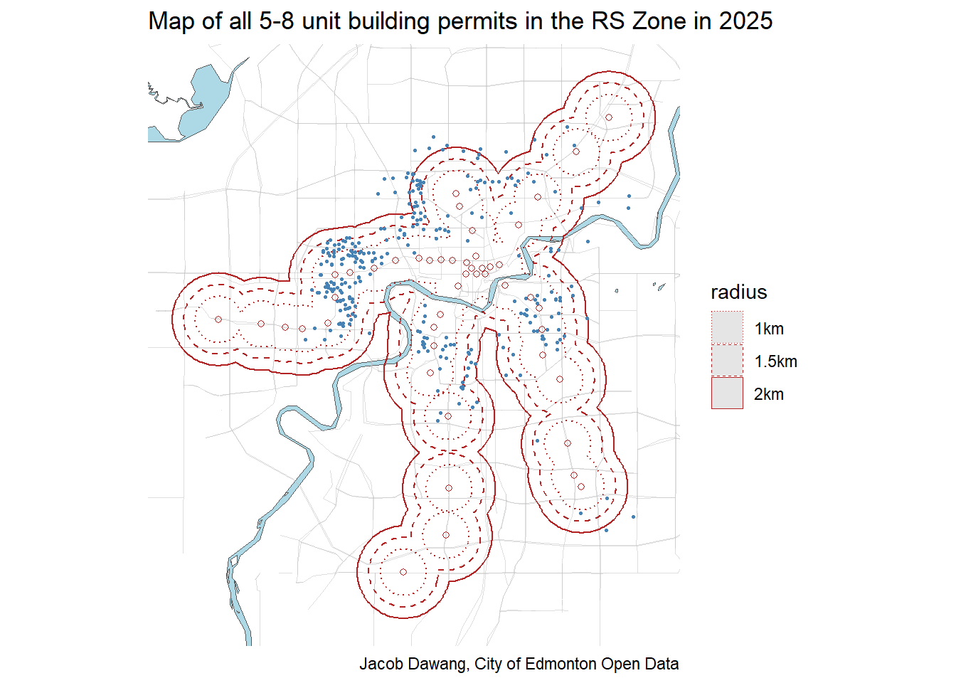 Once again, it is 5-8 unit rowhomes in the RS Zone that is driving more homes to be built near transit. Breaking out a map in Figure 6, we can see that the 5-8 unit rowhomes follow the path of the LRT almost religiously, especially the Valley Line West.
