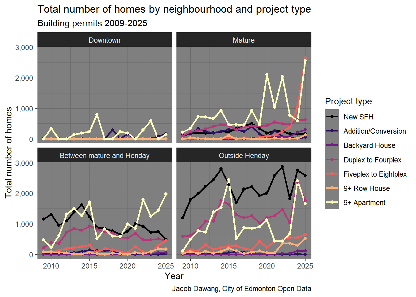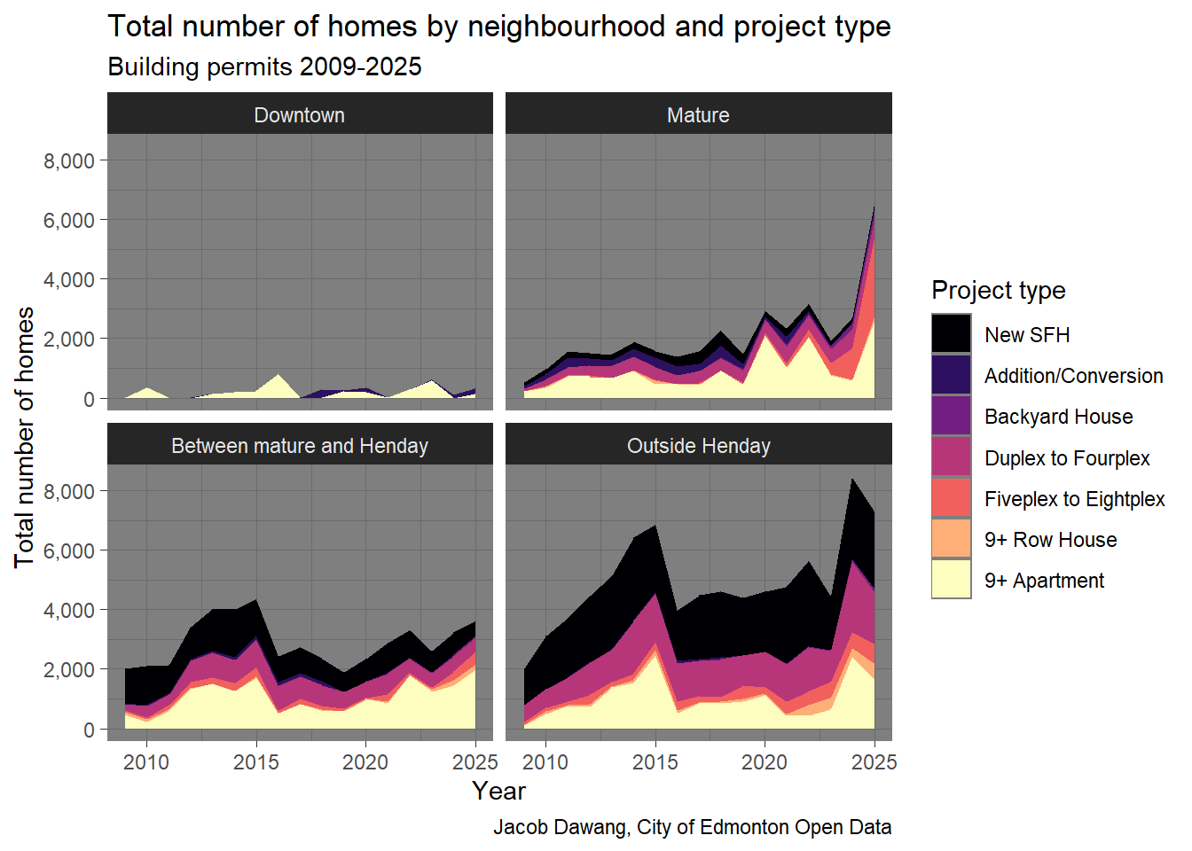 In Figure 4, we can see that 5-8 unit rowhomes and 9+ apartments drove the increase in homes in 2025. While 9+ apartments have historically reached the same scale as in 2025, the rise of 5-8 unit rowhomes is astounding. There is no other explanation except that Edmonton legalized 5-8 unit rowhomes in mature neighbourhoods at the exact right time, when demand was highest.